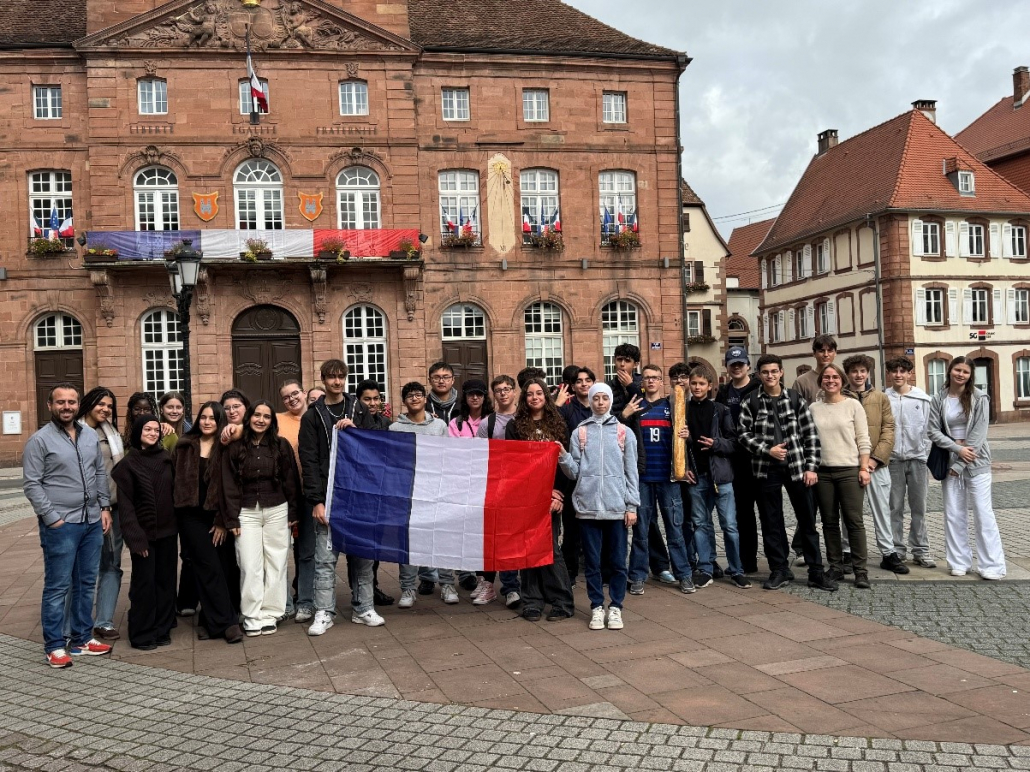 Am Donnerstag, den 9. Oktober unternahmen die Klassenstufen 9, 10 und 12 einen gemeinsamen Ausflug in die französische Grenzstadt Wissembourg. Begleitet haben uns Frau Zimmermann-Meszaros, Frau Beil und Herr Mantelli. Die Stadt liegt im Elsass und ist bekannt für ihre historische Altstadt sowie ihre gut erhaltene Architektur. Wir erreichten Wissembourg am Mittag und verbrachten dort etwa zwei Stunden. In der Stadt selbst teilten wir uns in Kleingruppen auf und erkundeten sie in einer Stadtrallye. Gleich zu Beginn besichtigten wir die beeindruckende Kirche Saint-Pierre-et-Saint-Paul, deren gotischer Stil ein bedeutendes Wahrzeichen der Stadt darstellt. Anschließend spazierten wir durch die engen, malerischen Gassen. Besonders schön war der kleine Fluss Lauter, der sich durch das Stadtzentrum schlängelt und uns den ganzen Spaziergang lang begleitete. Einige von uns nutzten die Zeit, um in einem Café französische Spezialitäten zu probieren, darunter frische Croissants und Quiche Lorraine. Die Jahrgangsstufe 12 hat sogar ein Mittagessen in einem lokalen Restaurant organisiert, in welchem es frisch zubereitete Tarte flambée gab. Trotz der kurzen Aufenthaltsdauer konnten wir in Kleingruppen einen guten Eindruck von der Stadt gewinnen. Der Ausflug nach Wissembourg war insgesamt sehr gelungen und bot uns die Gelegenheit, für kurze Zeit in die französische Kultur einzutauchen, eine sehenswerte Stadt kennenzulernen und unsere Französischkenntnisse mal so richtig anzuwenden.
