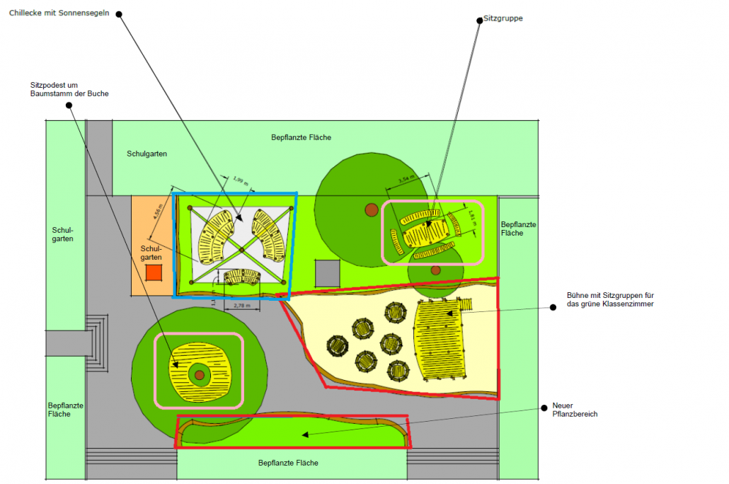 Ein Großteil des Innenhofs wird entsiegelt, es werden neue Pflanzflächen geschaffen und alte Flächen zur Begrünung erweitert. Die Schülerinnen und Schüler bekommen ein „grünes Klassenzimmer“ im Freien mit deutlich mehr Sitzmöglichkeiten und Rückzugsorten für Pausen im neuen Naturerlebnisraum Schule.