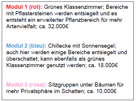 Im Rahmen des ersten und teuersten Moduls werden die Pflastersteine des Innenhofs entsiegelt, damit eine Bühne samt Sitzgruppe für das grüne Klassenzimmer entstehen kann. Zusätzlich wird ein erweiterter Pflanzbereich für eine größere Artenvielfalt entstehen. Die Kosten belaufen sich hier auf ca. 32.000,00 Euro.