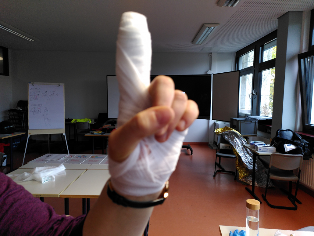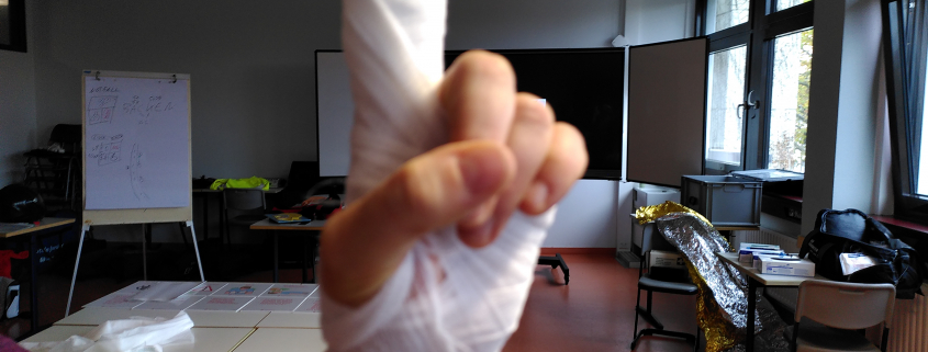 In regelmäßigen Abständen trifft sich das Kollegium des Heinrich-Böll-Gymnasiums an einem Nachmittag, um seine Kenntnisse in Erster Hilfe aufzufrischen. Die Veranstaltung, die dieses Jahr am 31. Oktober stattfand, wurde von einem Referenten der Johanniter-Unfall-Hilfe e.V. geleitet. Neben der Vermittlung theoretischer Grundlagen standen viele praktische Übungen auf dem Programm, beispielsweise das Anlegen eines Druckverbandes (siehe Bild) oder die Herz-Lungen-Wiederbelebung. Am Ende waren sich alle einig: Die Fortbildung war nicht nur interessant und kurzweilig, sondern hat auch dazu beigetragen, Handlungssicherheit in Notsituationen zu gewinnen.