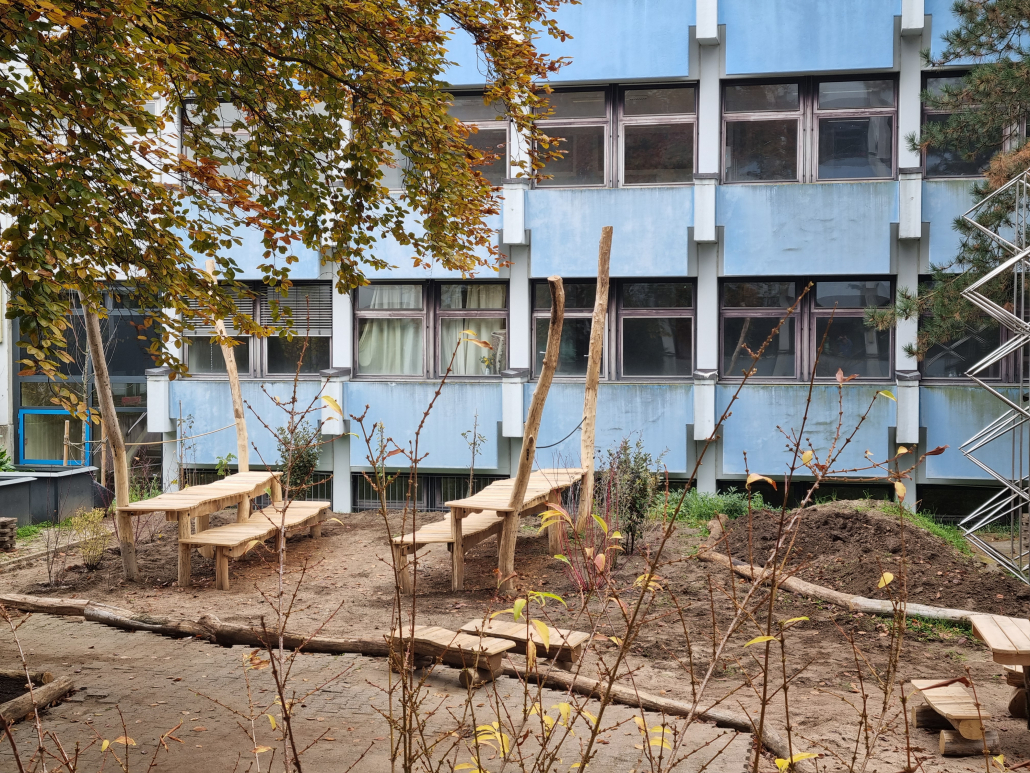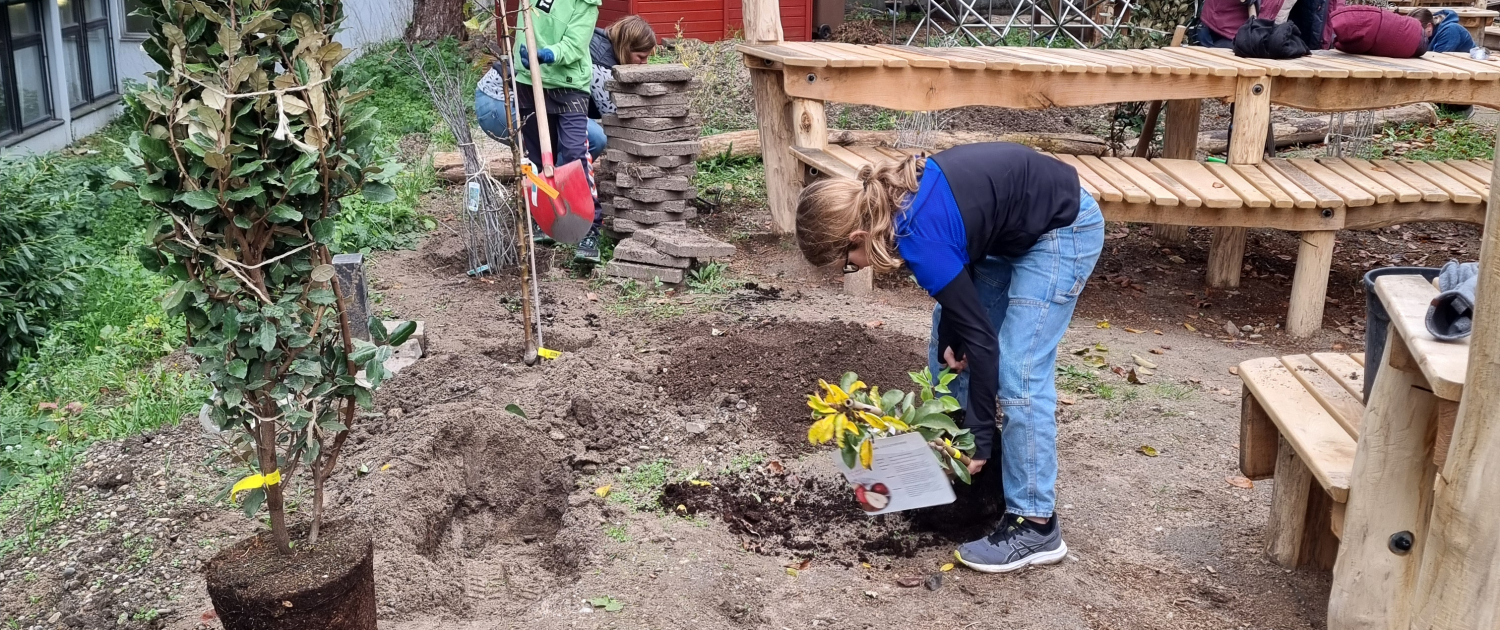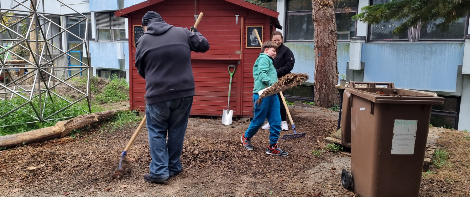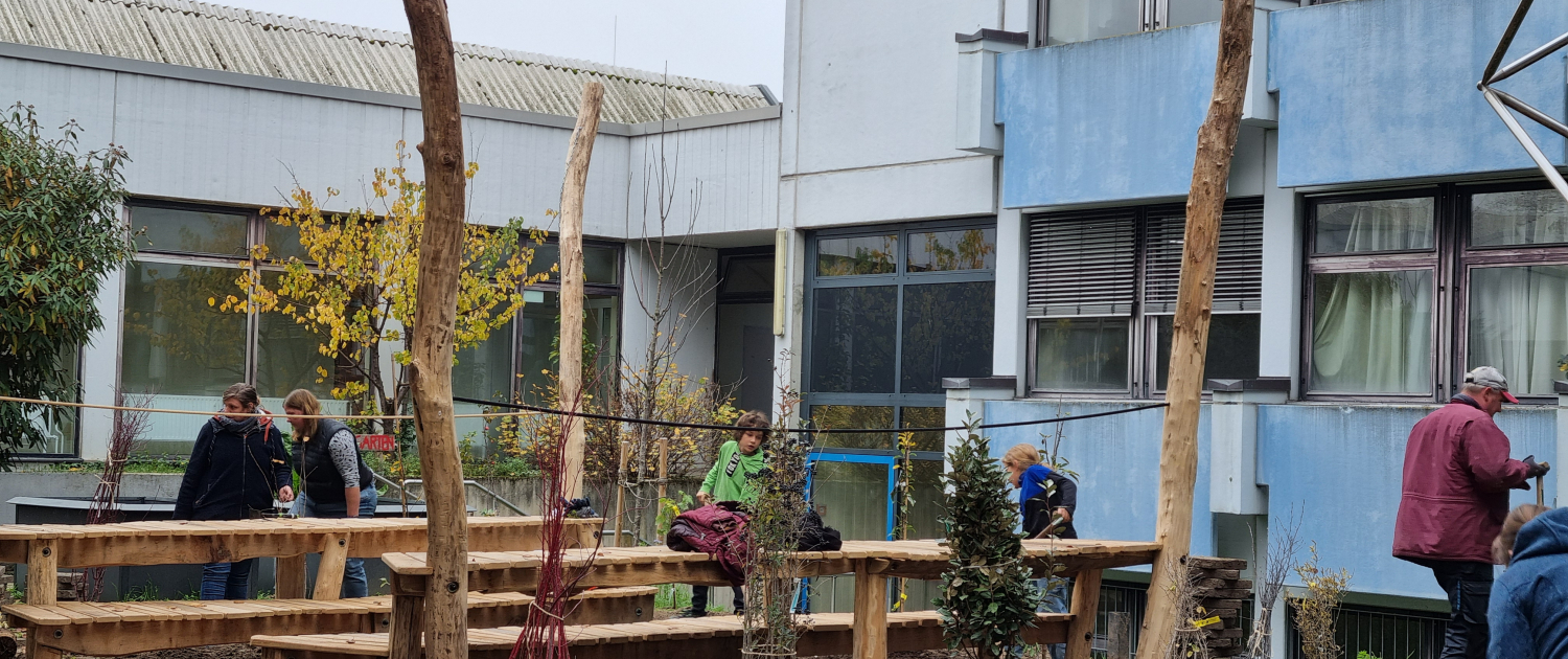 Am 08.11.2025 fand erneut ein Helfertag im Innenhof statt. 25 Eltern, Kinder und Kolleginnen waren hochmotiviert und fleißig. Der Erdboden wurde geebnet, damit bald die Holzhackschnitzel aufgebracht werden können. Frische Erde wurde auf die neu entstandenen Beete geschaufelt. Die Erde wurde dankenswerterweise schon in den vorangegangenen Tagen gespendet und per Anhänger geliefert. Die neu angeschafften Heckenpflanzen wurden neben die Sitzgelegenheiten gepflanzt und die Holzbänke bekamen ihren letzten Schliff. Außerdem fanden viele Blumenzwiebeln ihren Platz in den Beeten und werden das HBG im Frühjahr mit ihrer Blütenpracht verzaubern.