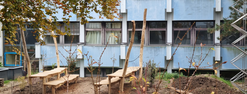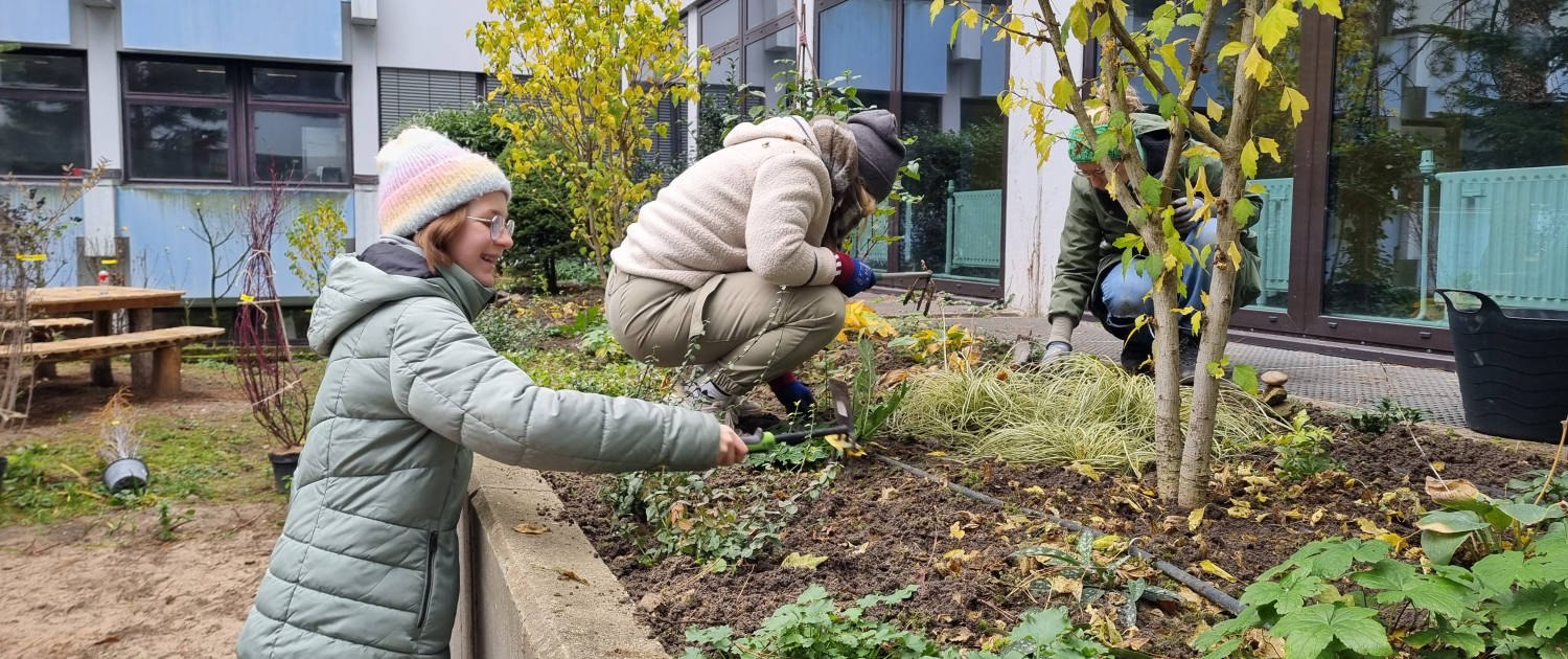 Dank der Helferinnen und Helfer ist der Innenhof wieder ein Stück grüner geworden und die Fertigstellung des „Grünen Klassenzimmers“ ist nahe. SCU