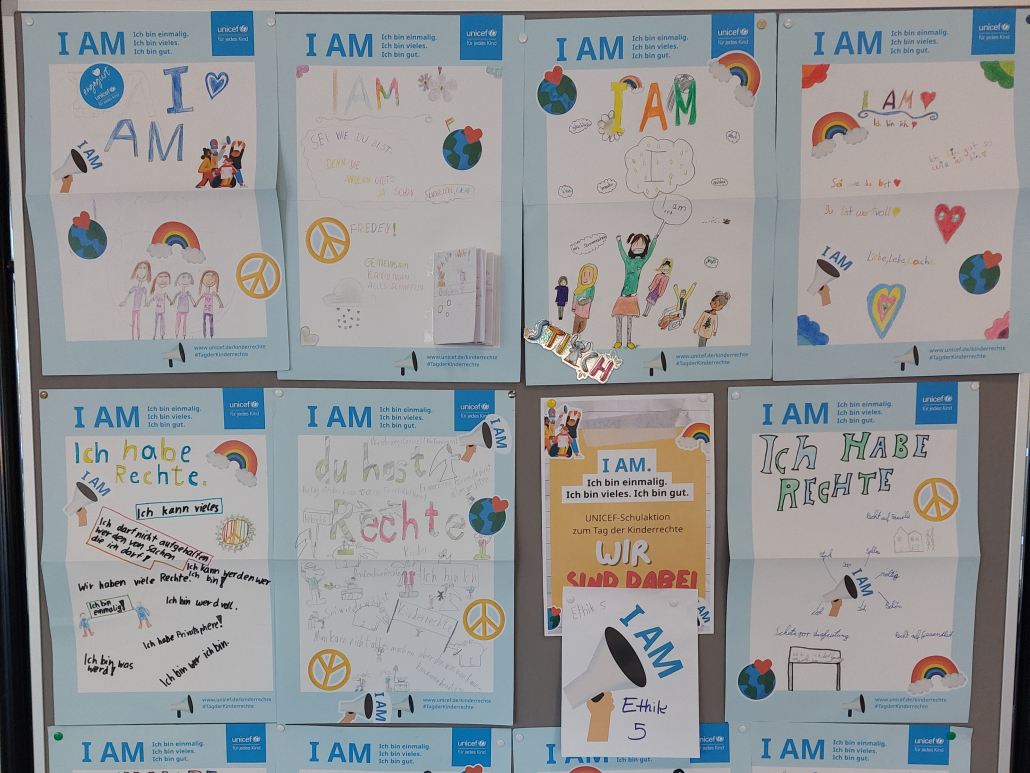 Zum Internationalen Tag der Kinderrechte machten auch wir auf diese aufmerksam. Eine Ethikklasse der 5. Jahrgangsstufe beteiligte sich an der Aktion „I AM. Ich bin einmalig. Ich bin vieles. Ich bin gut.“ von Unicef und setzte im Zuge dessen ein kreatives Zeichen für Kinderrechte, Selbstvertrauen und Zukunftsmut. BSL